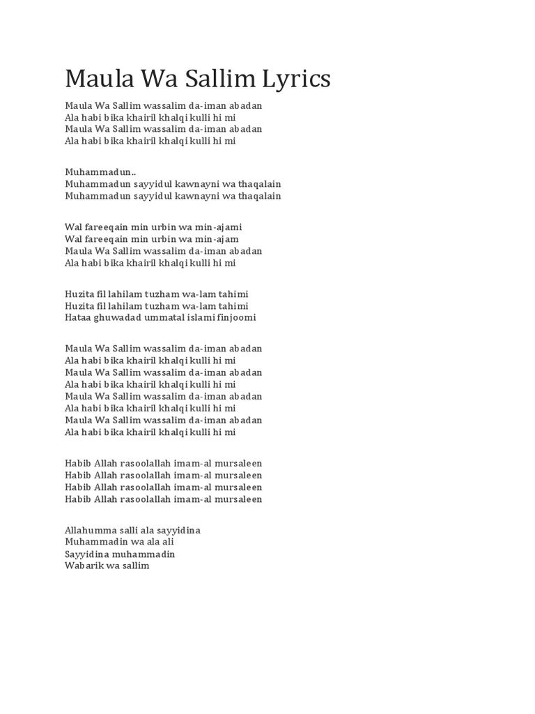 Allahumma Salli Ala Sayyidina Muhammadin Lyrics : Allahumma salle ala sayyidina wa maulana muhammadin wa ala aalihi wa asahbihi wa barik wa sallim.